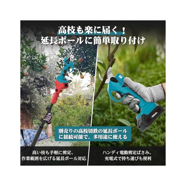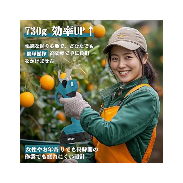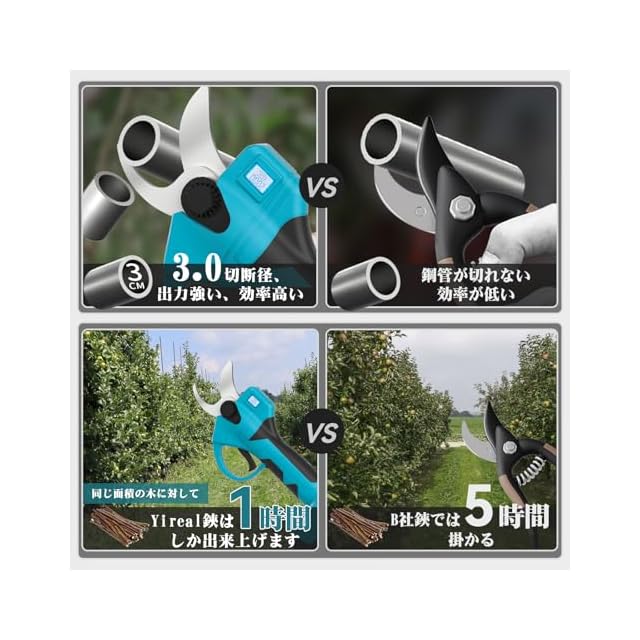 【30mm切断径&山本造園会社監修】Yirealの充電式剪定鋏はさいだい切断径30mmの枝を楽々に切れます。開き口は半開・全開の2段階に調節できる、半開なら小さな開口は作業時間と電力を節約し、全開なら太い枝を簡単に切れます。弊店の電動バサミは山本造園会社監修で植木屋さんが楽に剪定作業するために開発しました。この10年に世界中2万の造園会社に10万以上の植木屋さんが利用しています。