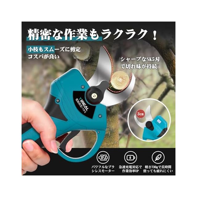【SK5ブレード&切れ味抜群】鋏の刃は日本製のSK5高炭素テフロン鋼から作られて高硬度で切れ味抜群です。ブラシレスモーター搭載してパワーが強くて、30mmまでの生木を1秒に瞬時に切断でき、切れ味が良くて切断面が平にキレイ、植木の健康を守れます。