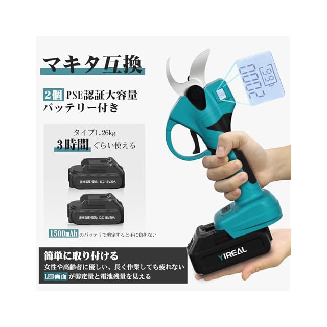 【PSE認証取得&マキタ18Vと互換】この充電式剪定は人間工学に基づき軽くて持ちやすいタイプです、女性や力が小さい方のために二種類のバッテリー用意しています。女性タイプは電池を含めて1.26㎏1500mAhで3時間ぐらい連続切断でき、3000mAh大容量なので一日の仕事に充分対応できます。バッテリーは既にPSE認証取得済なのであんぜんにご使用できますし、マキタ18Vバッテリーと互換できるし、非常に便利です。