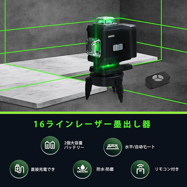 レーザー墨出し器、墨出しレーザー、4Dグリーンレーザー墨出し器、4x360°、水平器 レーザー ビルドとアライメント用、充電式バッテリー、リモコン、磁気回転スタンド レーザー安全基準:クラス2 16ライン 16X-A