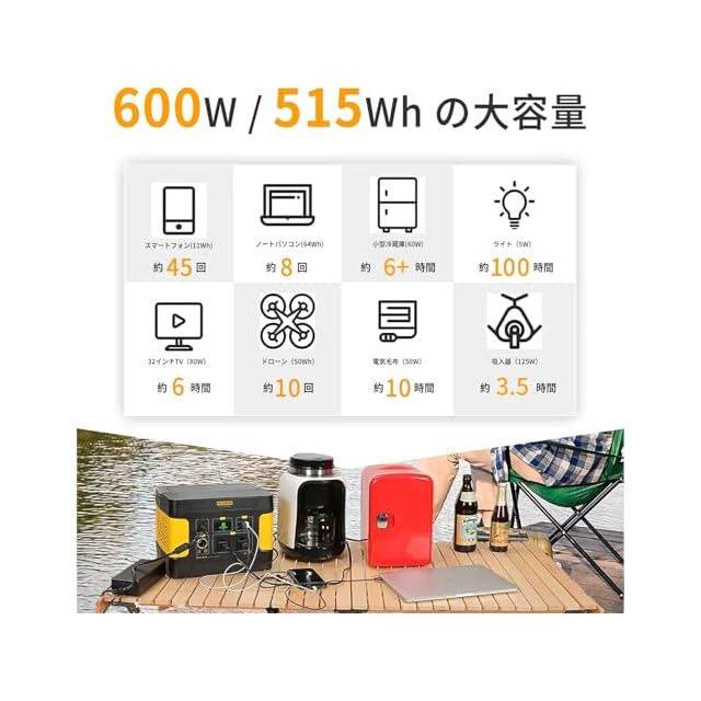 【大容量 515Wh/160938mAh】515Whの電力容量を持ち、他の用バッテリーよりも同じ電子機器を効果的に長く使用することができます。フル充電後、携帯電話、ノートPC、電気炊飯器、車載用冷蔵庫、ジューサー、ドローンなどを充電し、自宅/旅行/キャンプ/RVに使用することができます。多数の家電やデジタル製品が利用可能です。ご家庭の防災備品にも最適です。