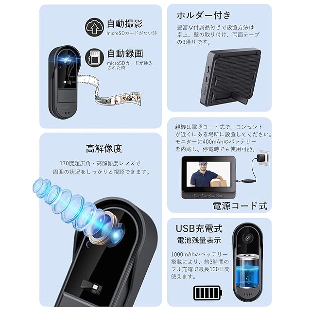 【USB充電式・長時間連続使用】ドアチャイムは充電式で、消費電力を抑える工夫も施され、1000mAhの大容量バッテリー搭載により、約3時間のフル充電で最長120日間使えます。電波干渉が起きにくい無線を採用し、コードレスで設置・取り外しが可能で、場所を選ばず玄関の好きな場所に設置できます。モニター付きのインターホンワイヤレス親機は電源コード式で、コンセントが近くにある場所に設置でき、400mAhの大容量バッテリーも搭載されており、停電時でも使用可能。