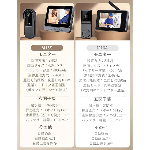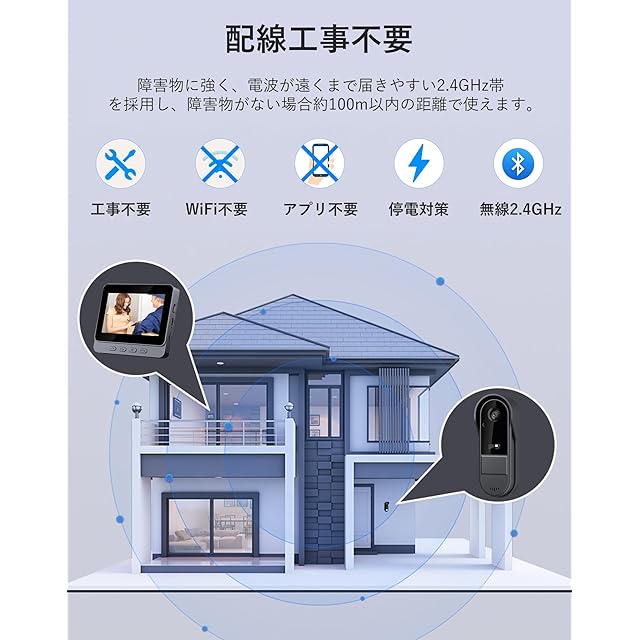 【配線工事不要・双方向通話】ワイヤレスインターホン子機とモニター親機はペアリング済みなので、配線工事やネットワーク設定が不要で、取付簡単なカメラ付きインターホンです。約95mm×54mmの4.3型のワイドカラー大型液晶ディスプレイと170度超広角レンズが搭載されており、撮影範囲が広く、来訪者はもちろん、複数人の来客でも周囲の状況もしっかりと視認できます。双方向通話機能を使ってコミュニケーションが取れますので来訪者の姿を確認しながら会話が可能。