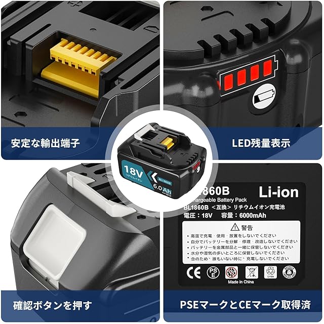 【優れる性能】ダブル新機能付き:残量表示✙自己故障診断。マキタ 18v バッテリーは高品質セル搭載で、耐久性が高く、長期間使用可能です。従来の製りも小型・軽量化し、コスパが良い商品です。純正バッテリーよりも圧倒的に安価。多種多様な機種に対応するパウーメモリ効果がないため、継ぎ足し充電も可能になりました。安心.安全.高品質セル搭載で、内部セルを守る保護回路を搭載しているため、バッテリーが良好に動作します。