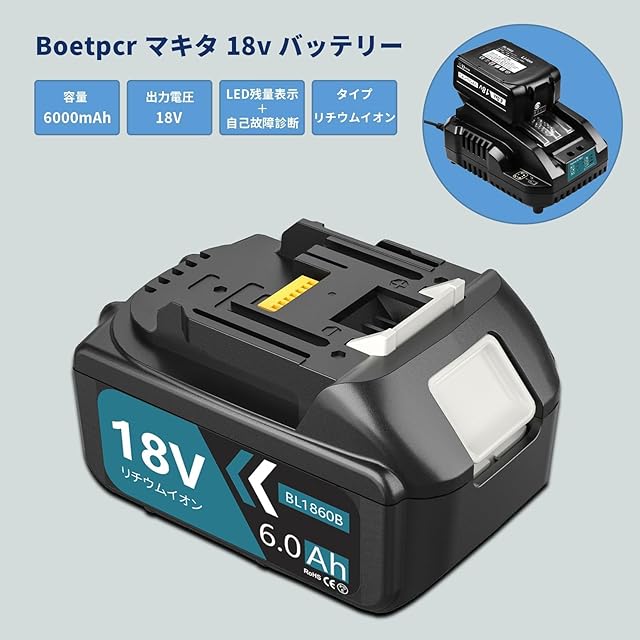 【商品仕様】Boetpcr 互換 マキタ 18v バッテリー BL1860B 電圧:18v 容量:6000mAh 個数:2個セット 種類:リチウムイオン電池 認証:PSE、CEマーク取得済み。高品質採用:多機能付き:バッテリーは残量表示が付いています。ダブル新機能付き:残量表示✙自己故障診断。BMS基板搭載には充電を制御する保護回路を内臓!過電流保護機能、過充電防止機能、過放電防止機能など保護回路が内蔵されて、ご安心してご使用頂けます。寿命特性、充電時間、連続使用時間が純正品と比べても遜色がないです。