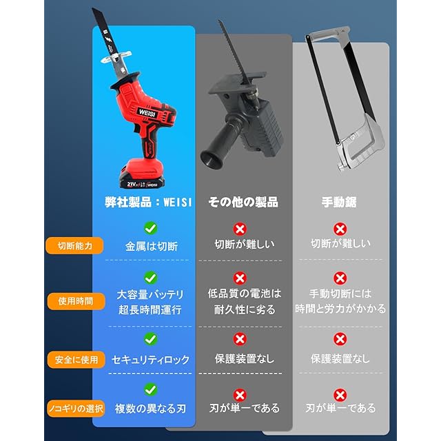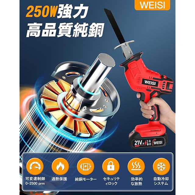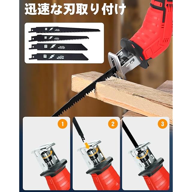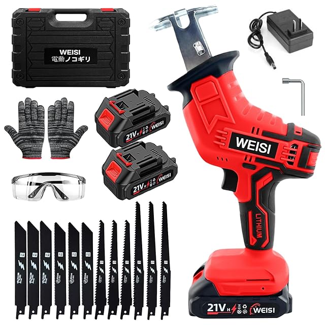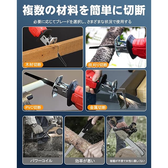 【様々な場合に適用】▲付属品:レシプロソー本体x1、大容量バッテリー×2、充電器x1、木工用6TPI 200mmブレード×3、木工用6TPI 150mmブレード×3、木工用10TPI 150mmブレード×3、金属用18TPI 150mmブレード×3、計12本の替え刃がセットに含まれています、収納ケースx1、日本語取扱説明書x1、保護メガネ×1、手袋×1。ニーズに応じ、ブレードを選択でき、様々な用途に対応できます。DIYや庭木の剪定、家具の解体 、粗大ゴミ解体、竹林整備、金属切断、薪作りなどいろんな分野に大活躍!