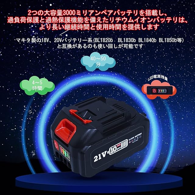 3.0Ahバッテリーを2個搭載:①マキタ製の18V、20Vバッテリー系(BL1820b BL1830b BL1840b BL1850b等)と互換が可能、使い回しができます。「他のブランドのチェーンソーの電池が切れたとき、替えのバッテリーだけ購入が難しそうですが、その頃にはチェーンソーも傷んでそうなので、本体ごと買い替え時期ということなのでしょう」 ②バッテリー残量がLEDでわかるのが便利です。③【安全性】高品質セル搭載で、耐久性が高く、長期間使用可能です。過電流、過充電、過放電防止の保護回路も内蔵しているので、安心してご使用頂けます。④バッテリーは通常4~5時間で充電できますが、 電動チェンソーはフル充電で40〜50分以上、正常に使用可能です。⑤バッテリー2個付きで、片方使っている間にもう片方を充電できて便利です。⑥バッテリーがグリップエンドに密着することにより安定したバランスが維持されます。