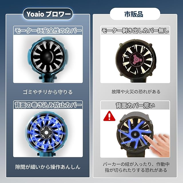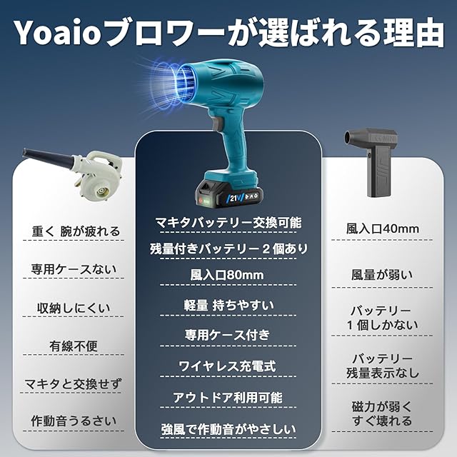 【弊社専用開発強力な80mm 12枚ファンブレード内蔵ブロワー】Yoaio ブロアーは市販の10枚ファンブレードより2枚ブレードを増加し、直径も通常の60mmより大きい80mmファンブレードを採用しました。12枚大ファンブレードはより集中したパワフルな気流を生み出し、効率アップと迅速な作業を実現できます。家庭用ドライヤーよりブレードの直径と数を増加することで、気流を均一に分散させ、気流損失を低減し、強力モーターと連動で最大65m/sの風速、120000RPMの高速回転を実現し、約850Gの推力に達しました。強力ブロワーとして洗車後の水飛ばしに最適です。弱い風にはさよならです。ようこそ、革新的な乾燥体験へ。