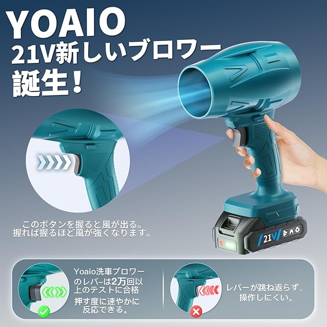 【 洗車 ブロアースイッチは2万回以上テストに合格】Yoaio 洗車 ブロワーのモーターはもちろん、電気エアダスターのトリガーも1個1個丁寧に点検し、トリガースイッチは全部2万回以上のプレステストに合格しました。ダストブロワー本体は高硬度、高耐熱性の素材で作られており、長期間の使用耐久性を備えています。ハンドル部分は手に合わせやすいラインを利用し、長時間作業し続けても手が疲れません。使用中にスイッチが元位置に飛び跳ねられない、トリガーを押しつづくがきついとの心配はもう要りません。