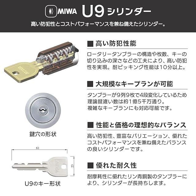 MIWA(美和ロック) HM用 ドアノブ 交換 鍵付き 玄関ドア 取替え 錠 HMD-1 U9 バックセット64mm ドア厚33〜41mm キー3本 交換手順書付