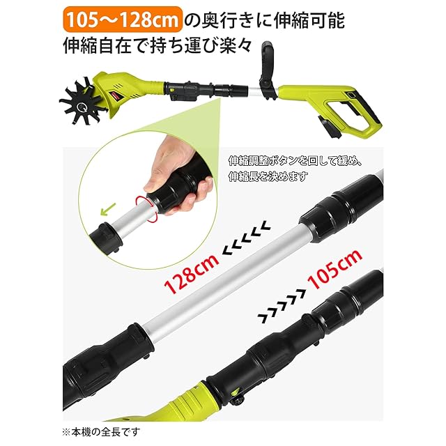 【デザインメリット】①伸縮自在:調整タイヤより、本機105~128cmの奥行きに伸縮可能なので、身長に合わせて腰や足に負担が掛からないように調整しましょう。②取り外し簡単:本機は2部分に外し可能で、使わない場合は収納・洗いに便利です。③スイッチ自動停止ボタン:作業完了/中止になる場合、スイッチから手放したら、両側の黒いボタンが真ん中に戻り、耕運機が自動に停止になります。④補佐ハンドル:取付・取外し簡単ですし、作業内容によって位置と角度が自由に調整でき、仕事効率アップ。取り付けする前に、下部の接続部分の蓋を外してください。蓋を取り外しないの場合、本機両部分を取り付けができない可能性があります。