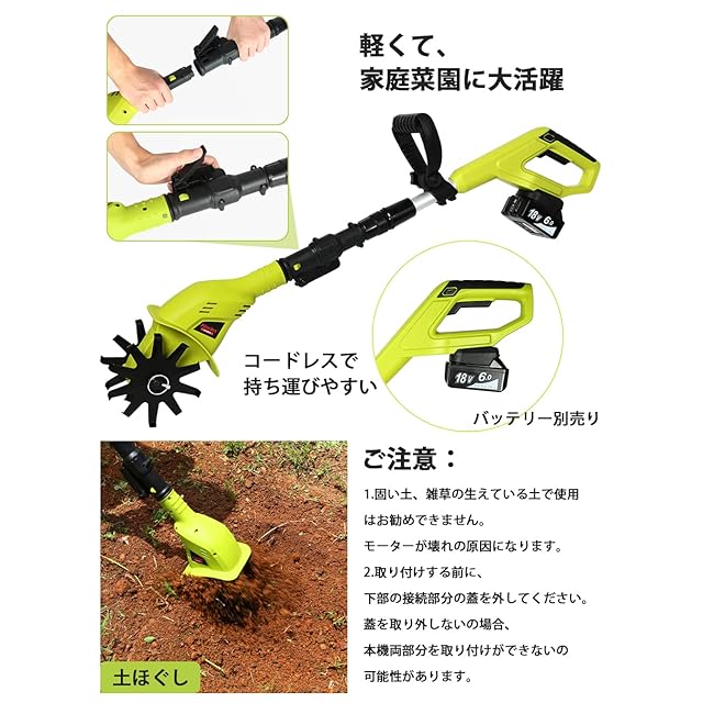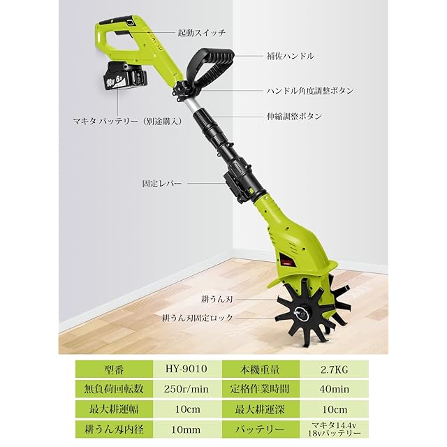 【商品仕様】■型番:充電式耕うん機 HY-9010 ■マキタ 18V バッテリー用 ■サイズ:(取り付け完了、伸縮なし)約105×23×15cm ■材質:スチール・樹脂他製 ■重量:2.7KG ■無負荷回転数:250rpm ■最大耕幅:10cm ■最大耕深:10cm ■耕うん刃:外径(約)φ150mm 空回転定格作業時間:(約)30分 ※使用状況により異なります。ご注意:本機は過熱保護機能付きます。30分連続使用後、一応使用を停止して、モーターの過熱による故障を防止してください。