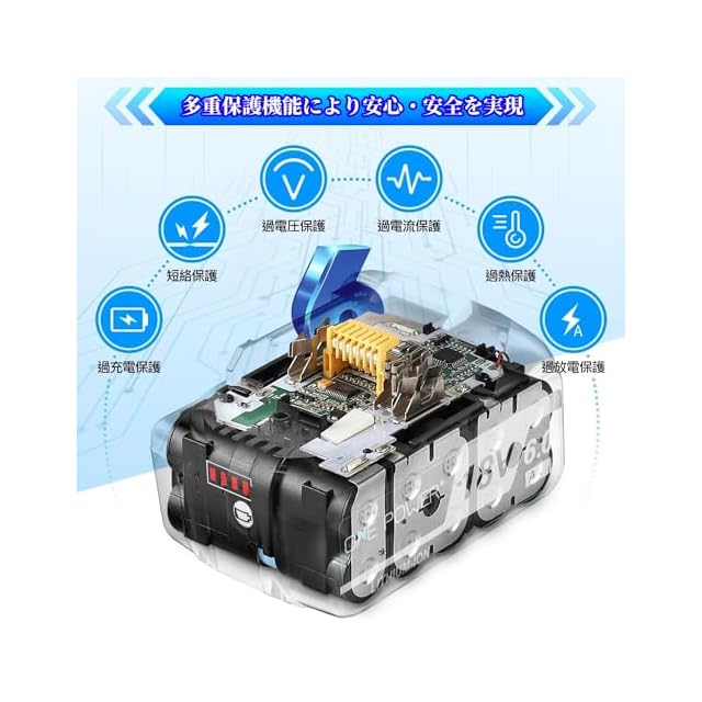 商品仕様:マキタ18V BL1860B互換バッテリー 電圧:18V 容量:6000mAh 認証:PSE、CEマーク取得済 本製品の互換 マキタ 18V バッテリーは、防火材料を使用したシェルと、安定性と長寿命を備えた電池セルを採用した改良モデルですので、安心してご利用いただけます。