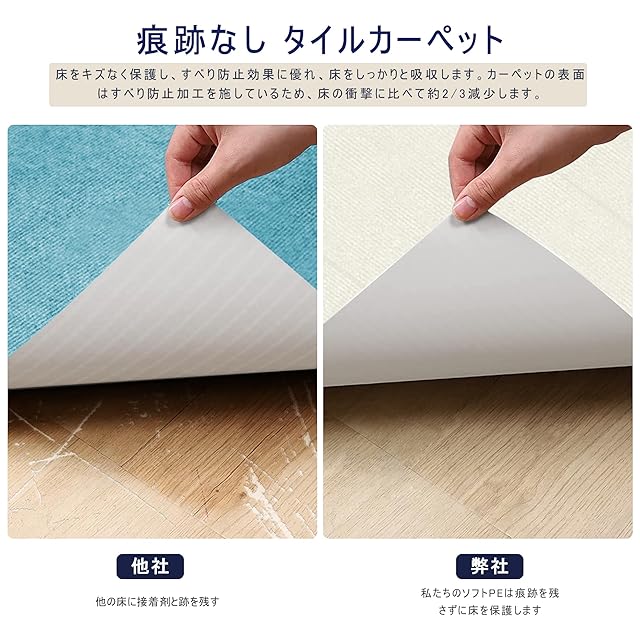 ✔【ジョイントマット 吸着マット】タイルカーペット底部の特殊構造が吸盤のようにくっつき、カーペットを叩いても動かず、どの床にもしっかりと吸着します。ペット連れのご家族、お子様、お年寄りに最適です。このリビングフロアマットの各ピースのサイズは約45x45cm、厚さ:4mm、表面はポリエステル、背面はTPRで、床に接着できます。