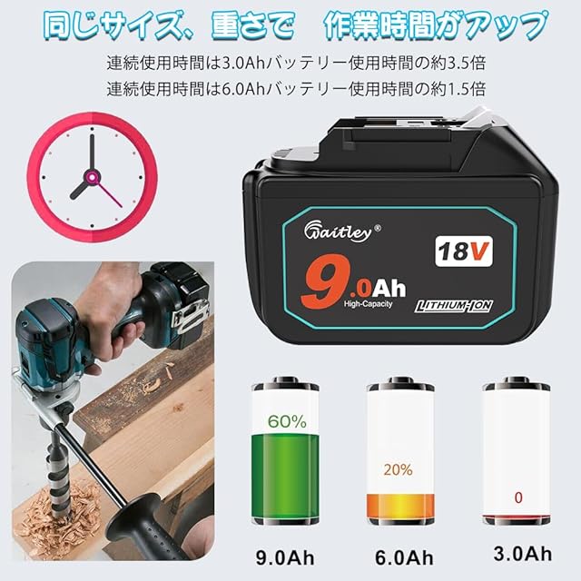 Waitley マキタ互換 18V バッテリー 9.0Ah マキタWTL1890 対応 9.0Ah大容量電池 LEDデジタル残量表示 マキタ18V電動工具用