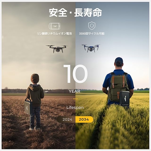 【安全・長寿命】劣化しにくいリン酸鉄リチウムイオン電池内蔵で、サイクル回数は3500回以上。1日1回の充放電で10年以上使用可能。PSE認証なども取得し安全性も確保され、非常用電源としても最適。高品質で長期間安心して利用できます。