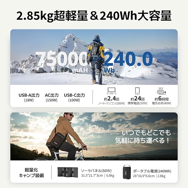 【大容量・高出力】240Whの大容量と150Wの高出力を誇る。一度満充電すれば、パソコンを約6回、スマホを約18回フル充電可能。コンセントがない場所でも、多くの機器や端末に対応し、スマホ、ノートパソコンのほか、ドローン、ポータブル冷蔵庫、ランタン、電動車椅子など、様々な電化製品に給電可能。