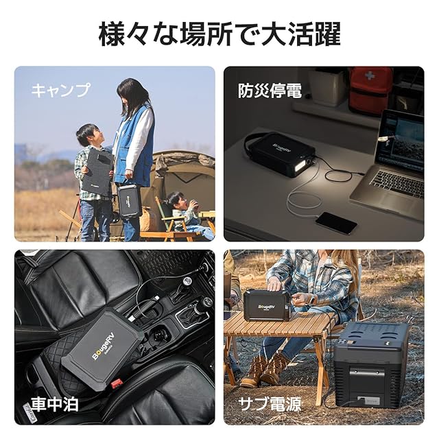 【多様な充電方法】AC、シガーソケット、ソーラーパネル、USB-Cの4つの方法で充電可能。さらに、USB-C入力は最大100Wに対応しており、スマホのアダプターでも簡単に充電可能。