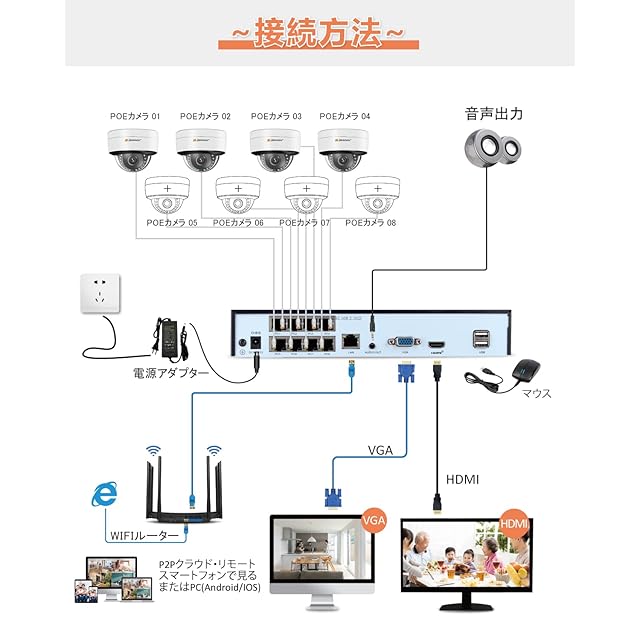 ♪【POE給電タイプ★設置簡単★通信安定⭐⭐⭐⭐⭐】POE給電の技術を採用し、一本のLANケーブルで接続すれば、監視カメラに電気と通信の搬送ができます。そして、配線は1本のLANケーブルで十分であり、電源アダプターが必要なし、とても簡単と便利な防犯カメラセットです。付属品には20メートルのケーブルがありますが、最大100メートルまでも対応ok!特に広い庭、駐車場、会社などの場所にふさわしいです。このようにPOEの有線式で稼働するカメラは、他の種類のカメラと比べてより安定的に動作ができ、高画質の映像でも、流暢かつ迅速に映れ、500万画素のフレームを落とさないように本来のあるべき姿をそのまま鑑賞ができます。