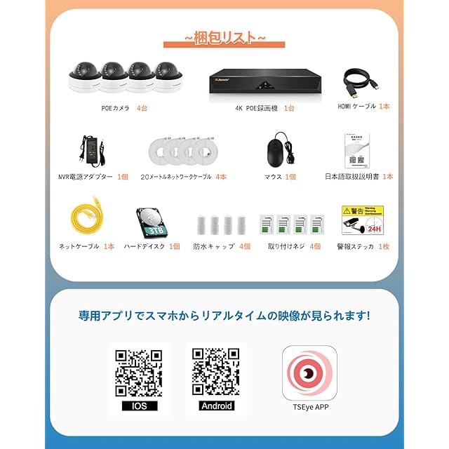 ♪【音声録画★3TBHDD内蔵⋆H.265+圧縮技術⭐⭐⭐⭐⭐】POE給電カメラにはマイクが付きで、映像の映りと同時に、音声の記録ができ、即時監視や録画再生の時に視聴されます。また、録画機には既に3TBのHDDが内蔵されており、4台のカメラとも24時間の録画をする場合は、約30日の録画データが保存されます。ハードディスクのメモリーがいっぱいになった時は、データが上書きされ、新しいデータが保存されるようになっており、録画の途中でメモリー不足などのエラーが発生しない!それに、H.265+のデータ圧縮技術を使用し、即時映像の画質をそのまま保ったうえで、容量を最小限にしてから圧縮、録画ファイルを生成しますので、原画質の映像が保存される同時に、ハードディスクの空間節約もできます。コスパ最高な防犯カメラセット!