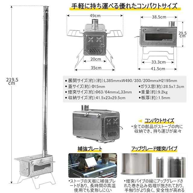 サイズ:使用時は(約)L385mmxW490/350/200mmxH2195mm、煙突は(約)ɸ63/64mmxL33mm、収納時は(約)41.5x23x29.5cmなコンパクトサイズに収納でき、持ち運び楽々。