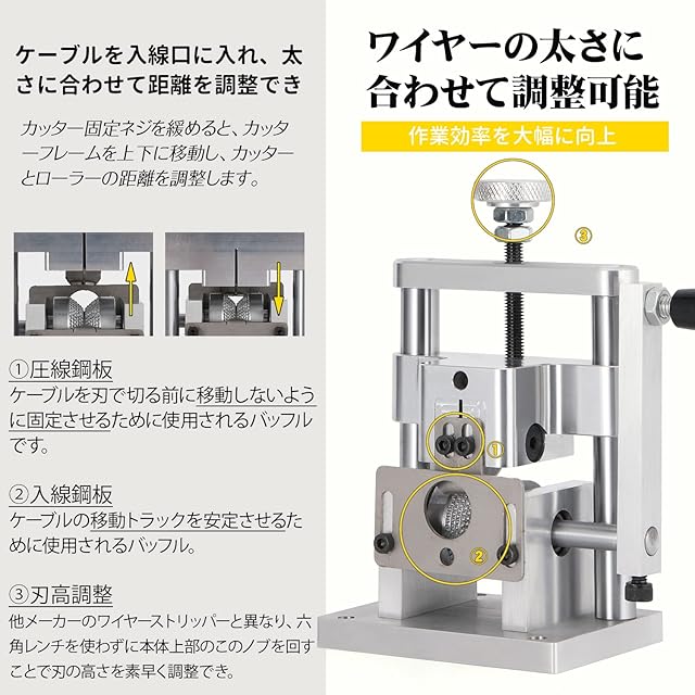 【ワイヤーのサイズに合わせて楽に調整】本体に配置された3種類の調整金具により、電線の太さがどんなに違っても、ストリップ範囲内であれば、ストリッパーの入線口を簡単に調整可能。