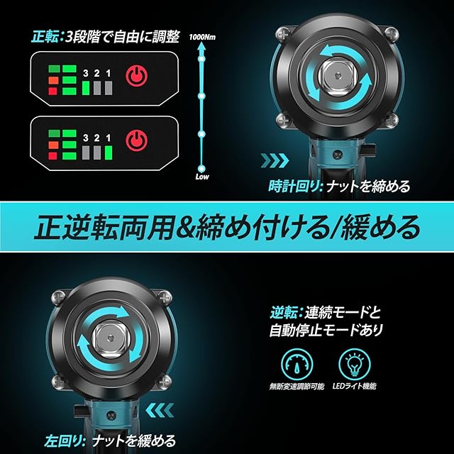 【正逆転両用&無段変速&LEDライト搭載】充電式インパクトレンチの両側の正逆転切り替えレバーを左右に押すことで、回転方向を変えることができます。正回転ではネジを締め付け、逆回転ではネジを取り外すことができます。無段変速機能がついており、本体のトリガーを握る力の強弱により、無段階に回転数を調整することができます。LED ライト付きことで、下穴やネジ頭の溝をはっきりと確認することができます。暗い場所で一人で作業する場合も、便利に操作することができます。