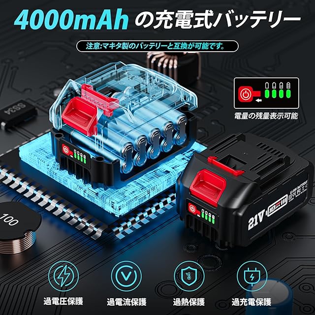 【4000mAhのバッテリー&ブラシレスモーター】大容量の 4000mAh のバッテリーにより、長時間の作業にも対応することができます。また、電池残量表示が付いており、電力状況が一目で分かることができます。それに、この商品の本体はマキタ 18V リチウムイオンバッテリー(BL1820b、BL1830b、BL1840b、BL1850b、BL1860b)にも対応することができます。ブラシレスモーターを採用することで、より強力で、長寿命で、迅速な冷却が可能で、高い効率を実現することができます。さらに、バッテリーには過温度保護や短絡保護などの多様な自己保護機能が備わっており、安全性と耐久性にも配慮しています。