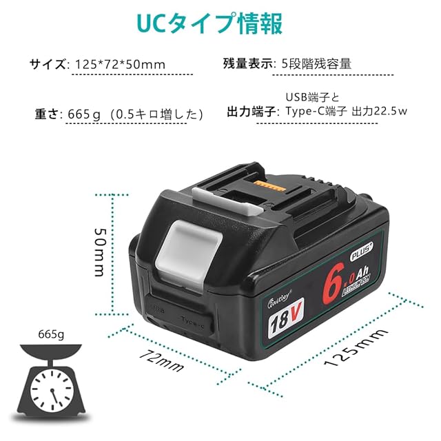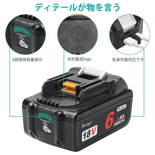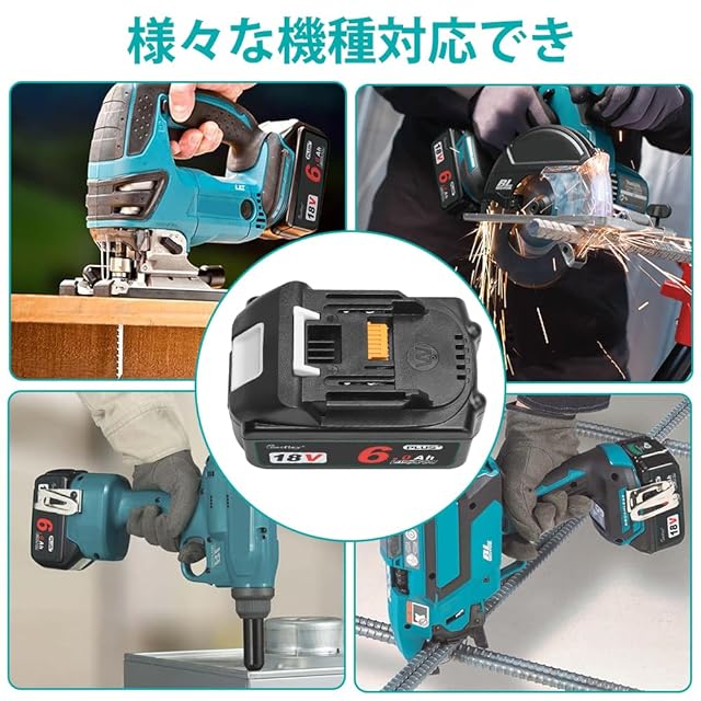【高容量】: 本製品は実際の6.0Ahを備えており、スムーズに長時間の作業が可能です。マキタの18Vコードレス工具を長時間使い続けることができます。パワフルで長持ちする高品質のセルを搭載してます。残量インジケーター: バッテリー残量を5つのLEDランプで確認できるので、作業の途中でも残量を把握できます。ユーザーはバッテリーの使用量を効果的に監視し、作業効率が大幅に向上します。