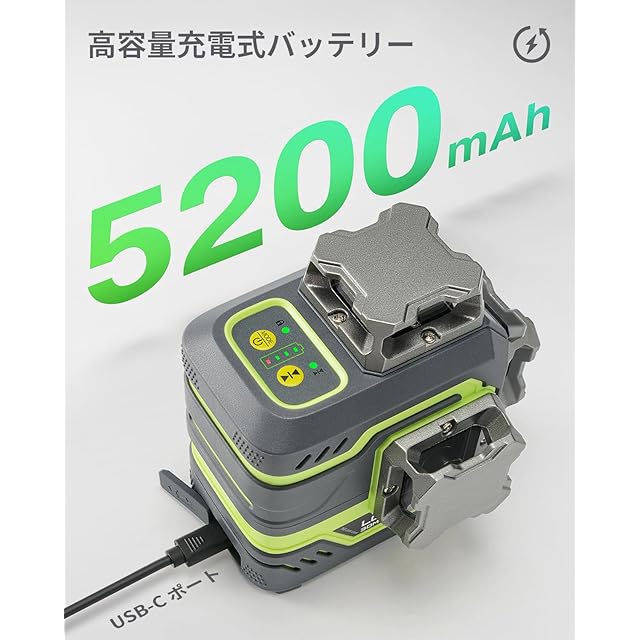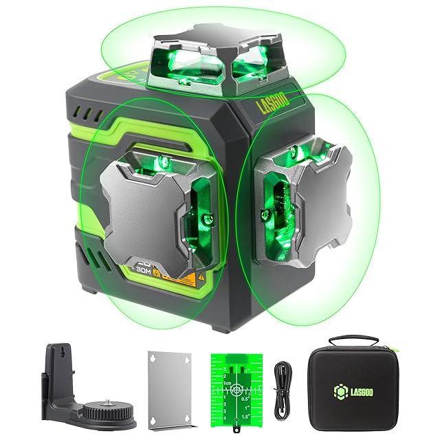 LasGoo LG-3DM グリーンビームレーザー水準器、セルフレベリング3x360°クロスラインレーザー、建築・絵画吊り下げ用、5200mAh内蔵充電式バッテリー、Type-Cケーブル、マグネット式回転スタンド付属