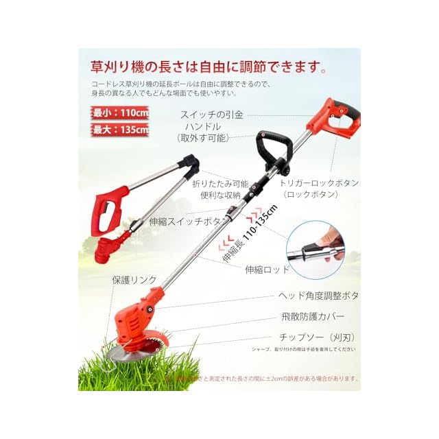 ⭐【軽量スリムボディで作業効率UP】片手でも楽に持ち上げられる1.8kgの軽量設計草刈機!110cm~135cmの伸縮式ポールと90°回転カッターヘッドで、狭い隙間や高低差のある場所も楽々アプローチ。女性やシニアの方でも無理なく操作できるバランス設計です。