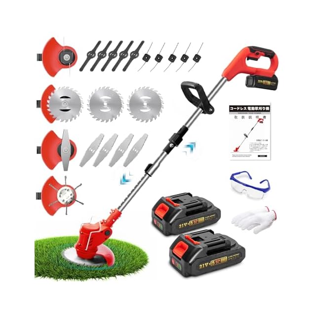 【パッケージ内容物】コードレ刈払機本体×1、21Vリチウムイオンバッテリー×2、急速充電器×1、各種交換刃セット(5種類、計18個)、補助ハンドル、保護メガネ、耐切断プロテクショングローブ×1組、取扱説明書(日本語版)簡単に収納:新型芝刈り機は簡単に折り畳んで収納でき、折り畳んだ後の体積は:59*15*14.5 cmである。従来モデルよりも体積が半分小さくなっています。