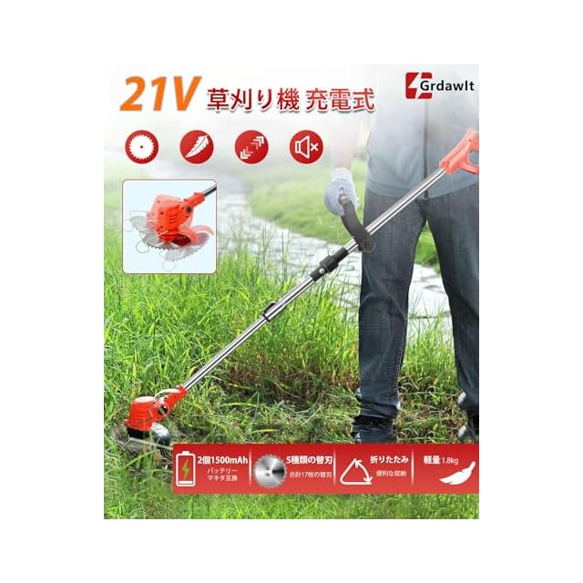草刈り機 充電式 草刈機 電動草刈り機 21V コードレス草刈り機 刈 1500mah 大容量バッテリー2個搭載 (マキタ バッテリーに対応) 刈払機 グラストリマー LEDバッテリー残量表示 伸縮110~135cm 軽さ 折りたたみ収納可能 低ノイズ 90°角度調整 5種類の替刃園芸に適用 枝切り 芝生 畑 雑草 除草 家庭用 園芸設備 刈払機 日本語説明書付