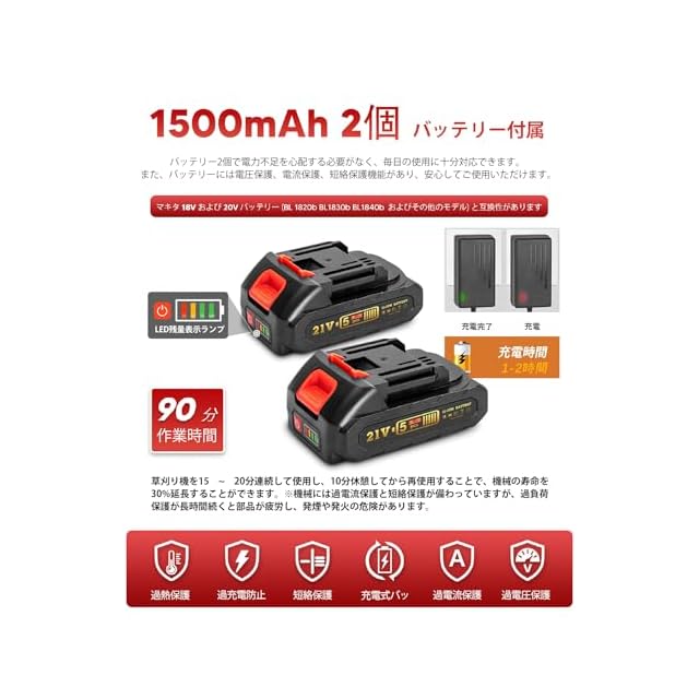 【長寿命バッテリーシステム】1500mAh大容量バッテリー2個付属(Makita 18V互換)。1充電で約30分連続稼働、充電時間はわずか2-3時間。LED残量表示付きで充電状態を一目確認。マキタ 18Vシリーズとの互換性あり(※別途アダプター必要)。予備バッテリー常時待機で作業中断ゼロを実現します。