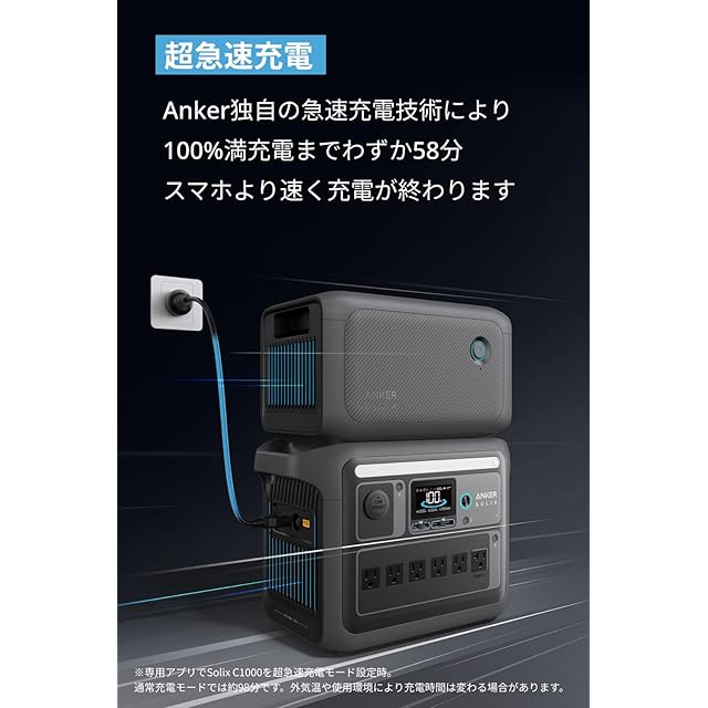 急速充電:100%満充電までたったの58分(※)。非常時でも短時間で十分な電力を確保することができます。Anker Solix C1000の充電完了後、本製品の充電が開始されます。※専用アプリでSolix C1000を超急速充電モード設定時。通常充電モードでは約98分です。外気温や使用環境により充電時間は異なる場合があります。