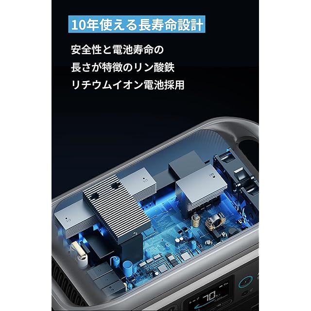 長寿命設計 : 本製品も一般的なポータブル電源に比べ約6倍長寿命なリン酸鉄リチウムイオン電池を搭載、約10年間安心してご使用いただけます。