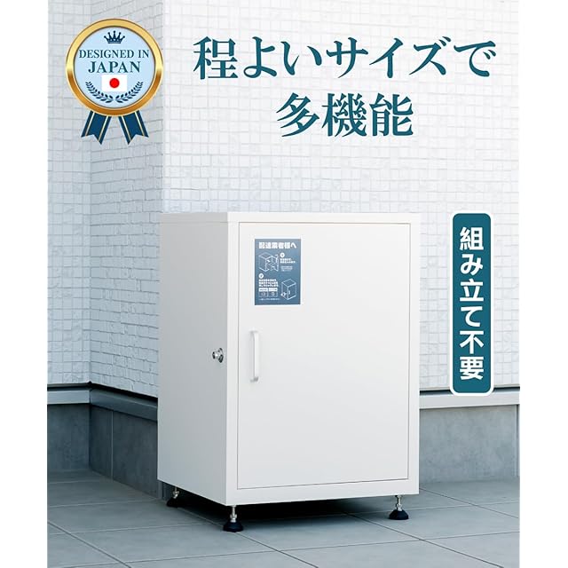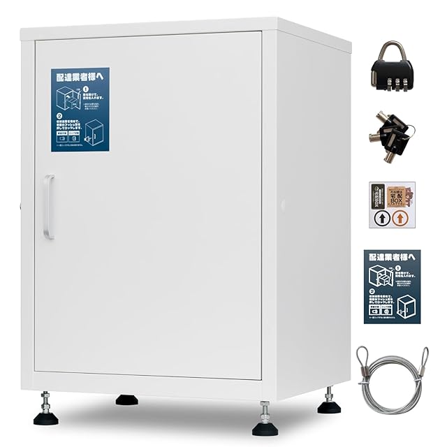 【細部までこだわり、既存品より数々ある改良、使いやすい】エアコン室外機とほぼ同じサイズで、並んだら、邪魔にならなく、外構の美観も損なわない。しかも、大容量で各運輸会社の箱に対応しております。ワンプッシュ錠の採用で、ワンプッシュで施錠できる、操作に便利の上、耐久性が大幅アップ。本体底部は二重構造で、湿気防止で耐久性、耐荷重が大幅アップ。荷物を衝撃から保護するプロテクトクッションを付いております。また配達員向けマグネット式案内シート、配達員向け案内ステッカー、印鑑ホルダも完備しております。