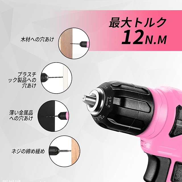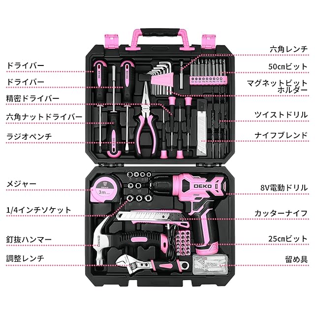 【8V電動ドリル付き】 工具セット 126点組 ピンク ホームツールセット 家庭用 ツールセット 日曜大工 DIYセット 作業工具セット 家具の組み立て 住まいのメンテナンス用 修理道具セット 便利な収納ケース付き