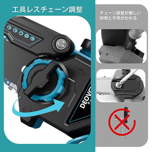 工具レスチェーン調整: チェーンの締め付け構造がアップグレードされ、チェーンの張り調整や交換が工具なしで簡単に行えます。 ドライバーやレンチが不要になり、時間と労力を節約できます。 このチェンソーは、市販されている他のチェンソーに見られる、チェンが緩みやすいという問題を解決している。
