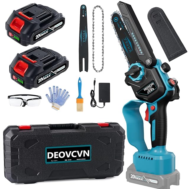 DEOVCVN チェーンソー 充電式 6インチ ハンディチェーンソー、ブラシレスモーター 自動給油機能 工具レスチェーン調整、 2.0Ah 大容量バッテリー2個搭載 バッテリー残量表示 充電式チェーンソー、 2セットのチェーンとガイドバー(1セットは取り付け済)、 DIYや木材の切断 庭木の剪定 軽量片手操作