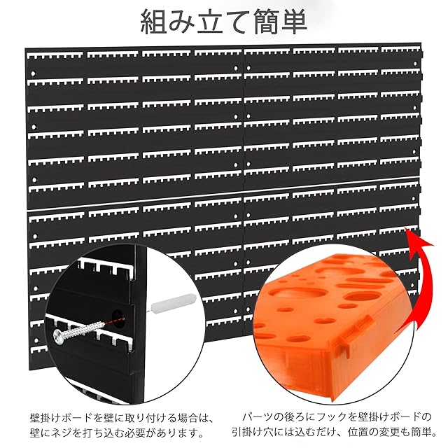【組み立て簡単】お好きな位置に壁掛けボードを取り付けて、後は自由にパーツをボードの掛け穴に差し込みだけ、誰でも簡単に設置できます。注:壁に取り付ける場合は、商品を固定するために壁にネジを打ち込む必要があります。