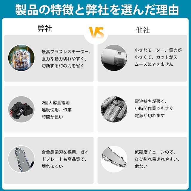 【最強ブラシレスモーター】Sipakeたかえだ 電動チェーンソー セットはパワフルなブラシレスモーターを搭載しています。他の製品より性能がもっと安定して、寿命が300%増加し、出力電力が75%増加し、エネルギー消費量が50%削減されて、切断効率が高くなります。作動時に火花が発生せず、モーターが摩耗しません、従来のブラシモーターの3〜5倍の耐用年数を持っています。長年ご愛用して頂けます。