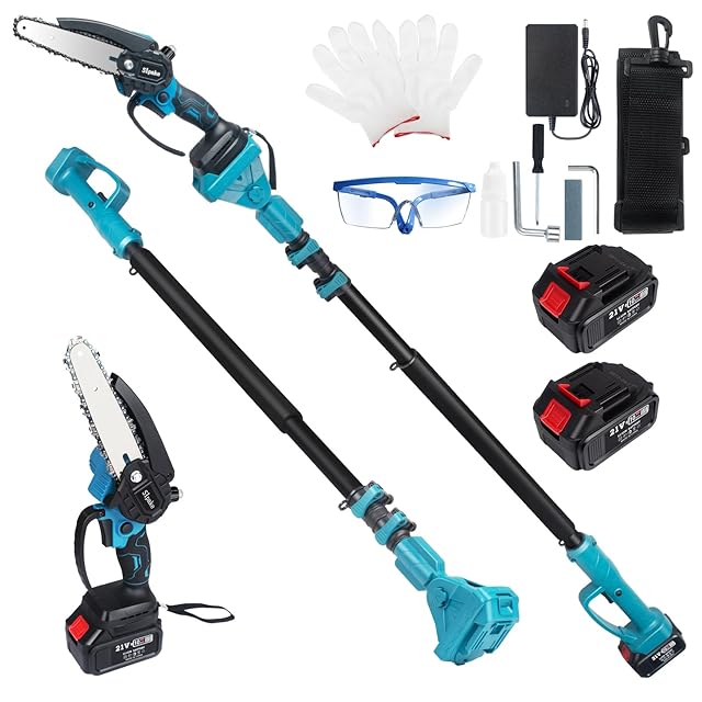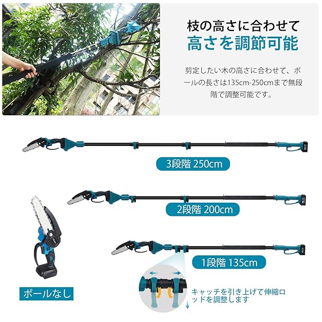【一台2役・2-in-1 の高性能高枝切り電動チェーンソー】 ①Sipake 高枝切り電動チェーンソー の2-in-1組み合わせセット、2.5メートルの伸縮延長ポールが付属して、ポールの長さは1.35メートルから2.5メートルまで無段階で調整可能で、高所の木の枝を簡単に切れます。②延長ポールを外すと、小型チェーンソー単品として低い木を切断できます。作業環境とニーズに合わせて使用できます。非常に便利な組み合わせ高枝切りセットです!