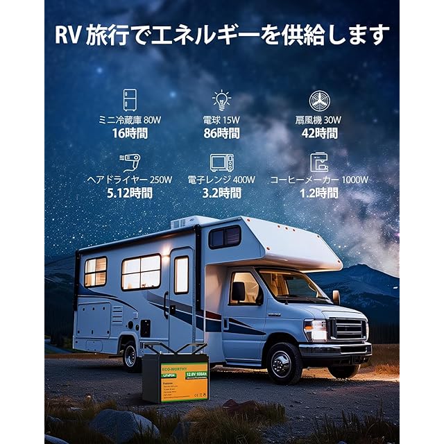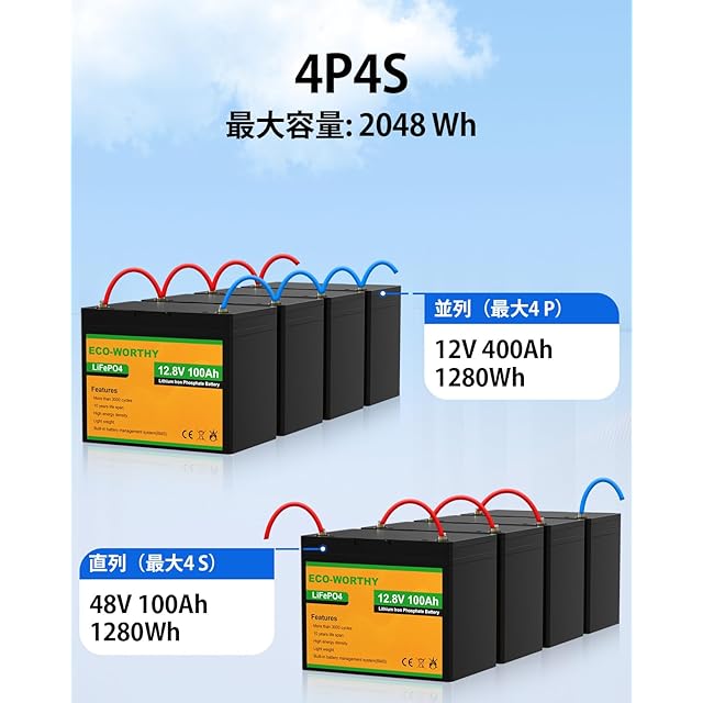 【幅広い用途】幅広い応用できます。冷蔵庫、防犯カメラ、エレキモーター、キャンピング車、サブバッテリー、、車中泊、オフグリッド、災害対応、ソーラーシステムなどに応用できます。最大4S4Pで20.48kWhをサポートしているため、必要に応じてバッテリーシステムを簡単にDIYできます