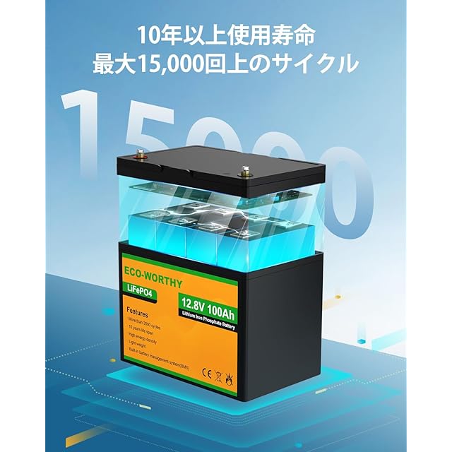 ECO-WORTHY 12V 100Ah リン酸鉄リチウムイオンバッテリー Aグレードセル BMS保護 小型 軽量 4000回以上 容量拡張 トローリングモーター RV キャンプ オフグリッド システムに最適 防災 PSE技術適合