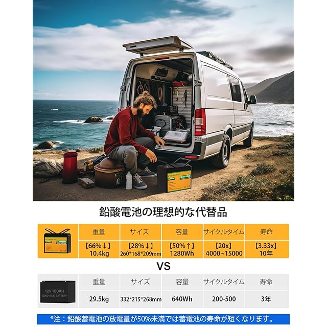 【10年寿命】4000回のディープサイクル後も80%の容量を維持、鉛蓄電池の10倍以上(300〜400サイクル)です。10年間の耐用年数を持ちます。鉛蓄電池には戻れない