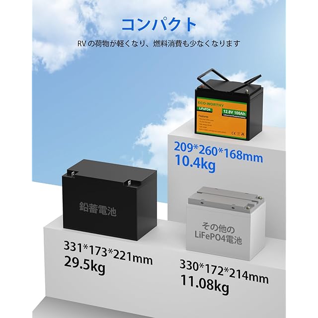 【軽量】寸法:260*168*209mm 重量:10.4kg。鉛バッテリー比較すること、遥かに軽く長持ち。鉛バッテリーの半分ぐらいの重量です。他社製のノーマル同容量バッテリーより小さいです