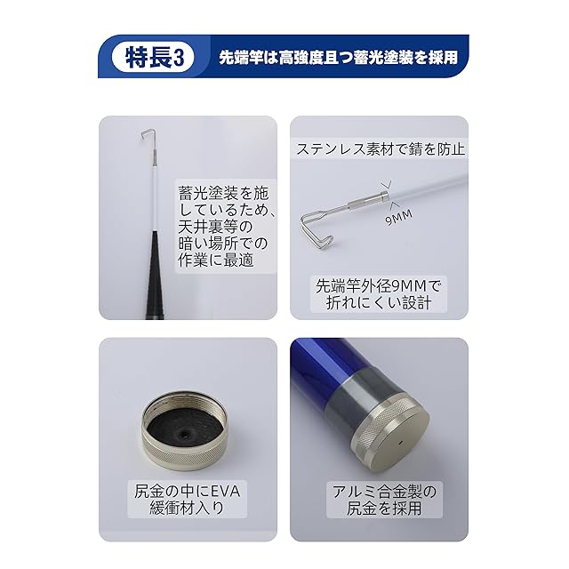 耐久性 ステンレス製のフック金具とアルミ合金製の口金・尻金を使用しており、長期間使用しても錆びにくく、耐久性に優れています。