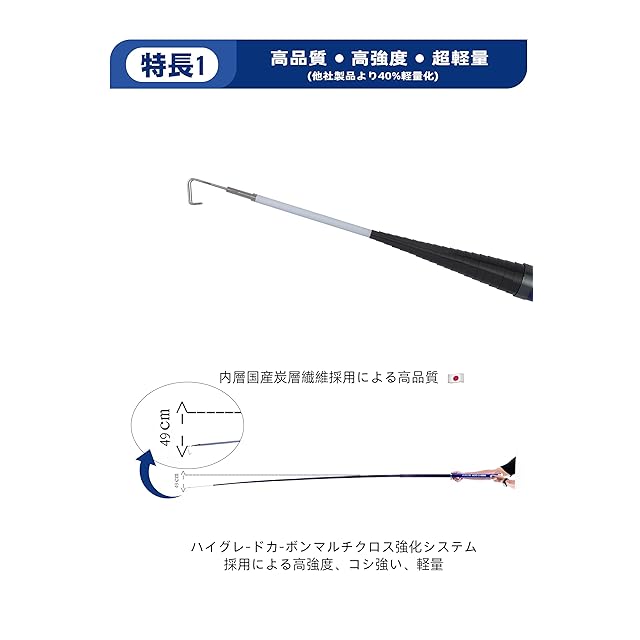 コンパクト安全 収納時はわずか44cmのコンパクトサイズで、持ち運びに非常に便利です。作業時には最大8mまで伸長可能。高い伸縮性を持ち、どんな作業現場でも適応します。 手元竿が電気絶縁性良好のGFRP製で、安全。