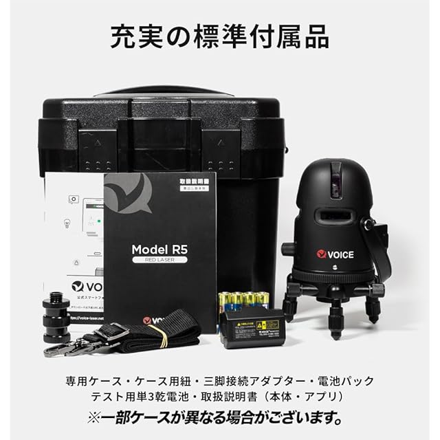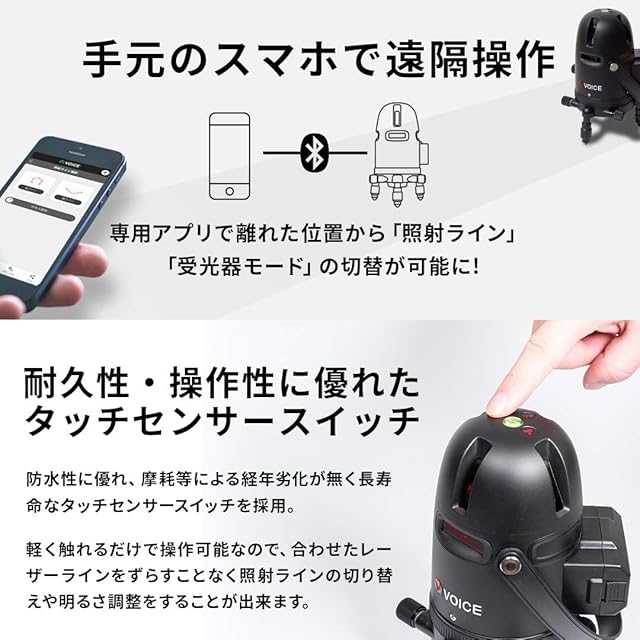 ✅【シリーズ累計 96,000台突破!】VOICE レーザー墨出し器から、デザインと機能をアップグレードしたモデルが登場。マットブラックを基調としたスタイリッシュなデザイン。専用アプリを使うことで、手元のスマートフォンから「照射ライン」や「受光器モードの」の切替が可能に。
